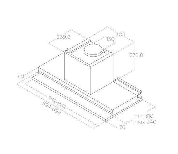 Digestor, Sací výkon minimálny / maximálny: 270 – 580 (700) m3/hod, Energetická trieda: B, Hlučnosť minimálna / maximálna: 52 – 67 (71) dB (A)