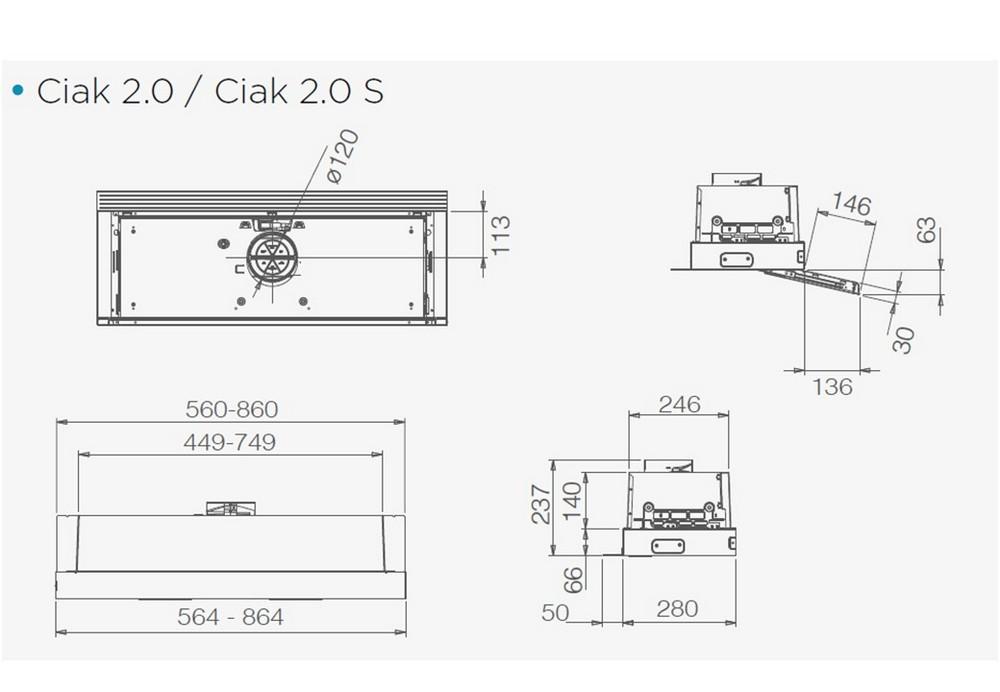 Skrytá inštalácia digestora CIAK 2.0 GR/A/60 umožňuje vytvoriť jednotný vzhľad skriniek kuchyne. Jeho sací výkon je 130 - 225 m3/h pri hlučnosti 47 - 55 db (A) . Je vybavený osvetlením LED s výkonom 2x3 W teplotou 2700K a svietivosťou 121 LUXOV.. Vďaka výsuvnému sklu je účinnosť zachytávania pár ešte vyššia a ochránené sú aj dvierka skrinky.