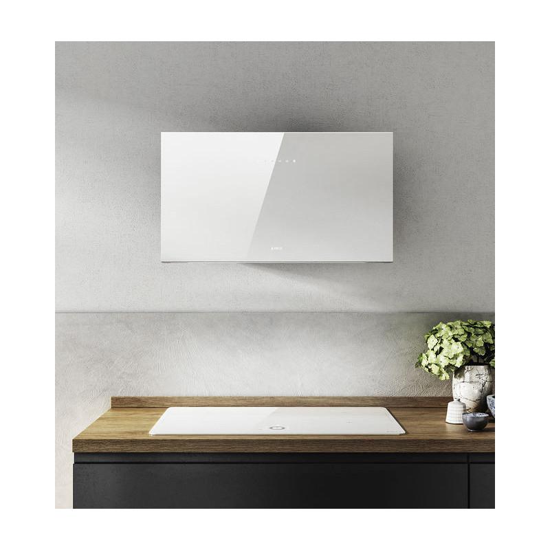 Komínový odsávač pár, Prevedenie: biele sklo, Šírka: 55 cm, Priemer výstupného otvoru: 150 mm.
