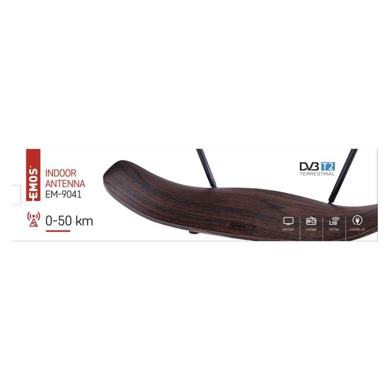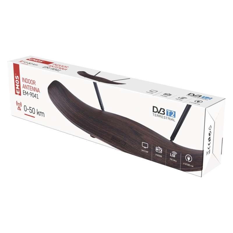 Digitálna anténa EMOS EM-9041 dokonale vypĺňa dieru na trhu s domácimi anténami. Svojim originálnym tvarom a dekorom tmavého dreva jasne ukáže, že obyvatelia bytu, v ktorom sa ocitne, majú evidentné módny vkus. Radí sa medzi všesmerové antény (s prijímacím uhlom 360°), ktoré spoľahlivo dekódujú TV aj rádiový signál (FM, DAB, DVB-T a DVB-T2). Bezchybný obraz aj zvuk vám zabezpečí jej vstavaný nízkošumový zosilňovač.
