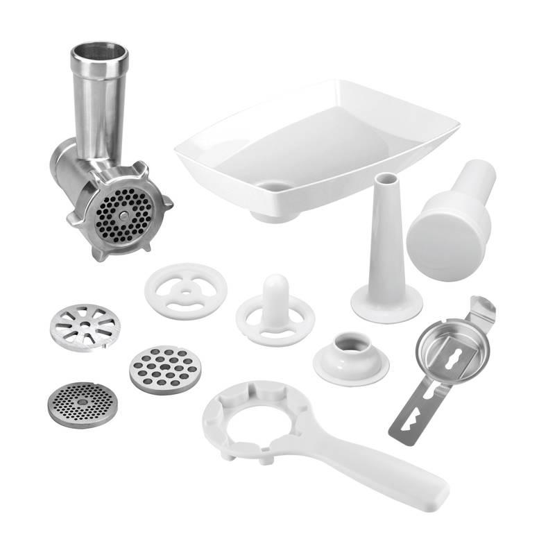 - Mlynček na mäso o priemere 62 mm (4 veľkosti mlecích doštičiek, nadstavec na výrobu údenín, nadstavec na výrobu Kebbe, tvorítko na cukrovinky, pechovadlo, násypka, uvoľňovací kľúč)