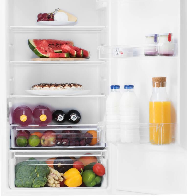 Kombinovaná chladnička v bielej farbe, ktorá sa vstavia do korpusu skrinky. Interiér je osvetlený moderným LED svetlom, ktoré nielen že ušetrí energiu, ale má predovšetkým výbornú svietivosť.