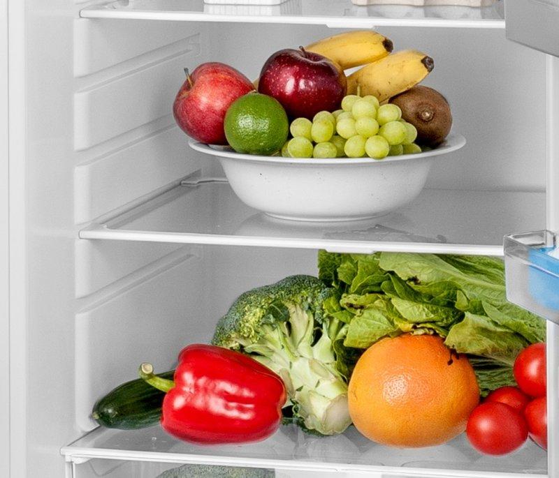 - Chladiaci priestor s objemom 171 l rozdeľujú 3 sklenené police z tvrdeného skla, ktoré si môžete výškovo prispôsobiť. Nechýba ani box na zeleninu a ovocie v spodnej časti.