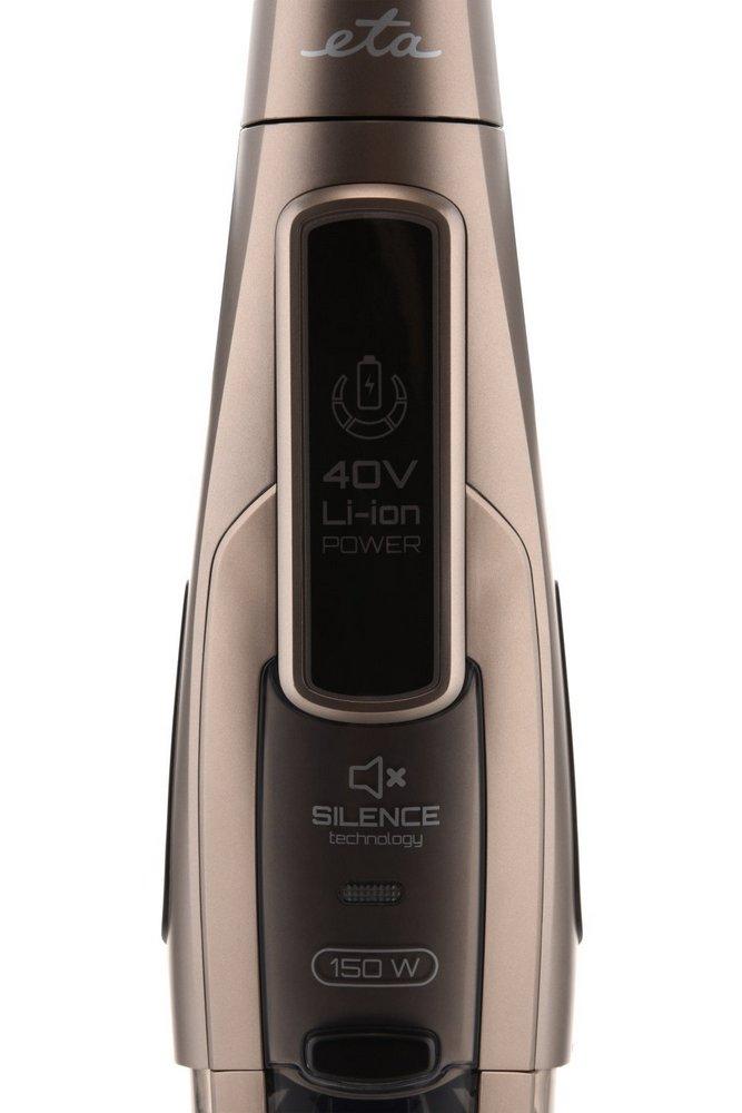 Pri práci nie ste limitovaný žiadnou dĺžkou napájacieho káblu, pretože tyčový vysávač je poháňaný výkonným Li-Ion akumulátorom 40 V, ktorý možno ľahko vytiahnuť a vymeniť. Jedná sa o akumulátor, ktorý sa nabíja po dobu 5 hodín a zaistí vám extra dlhú prevádzku, a to až 90 minút vysávania. Prevádzka a nabíjanie tyčového vysávače vám zobrazuje svetelná signalizácia. Dobíjacia základňa slúži nielen k jednoduchému nabíjaniu, ale aj k praktickému uskladneniu tyčového vysávača. Pre lepšiu viditeľnosť vysávacích plôch slúži dostupné svetelné LED diódy.