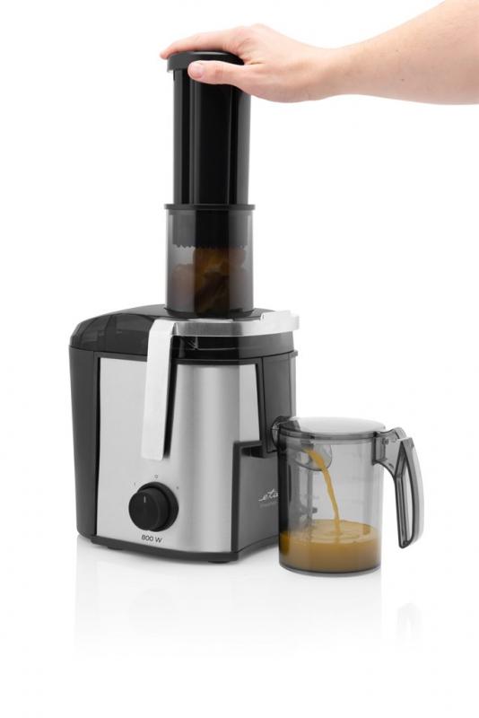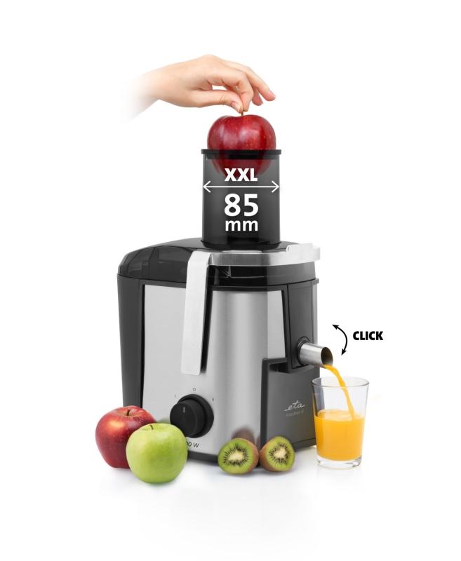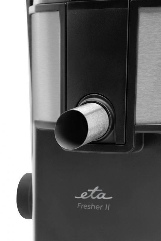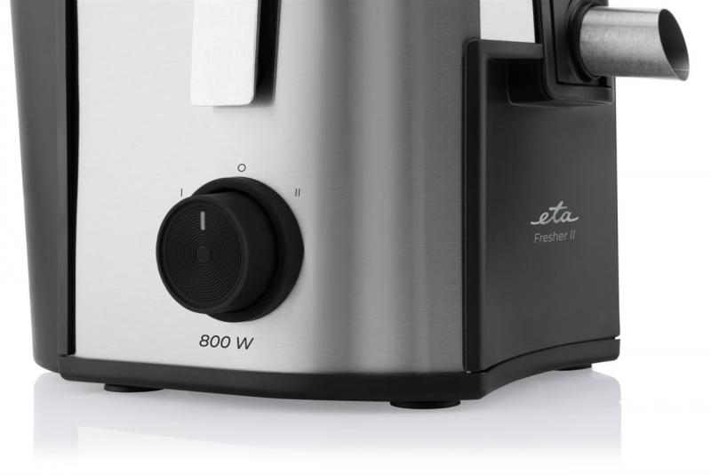 Motor s príkonom 800 W si poradí ako s mäkkým ovocím, tak aj s tuhšou zeleninou. Vďaka skutočne veľkému XXL plniacemu otvoru (85 mm) môžete do odšťavovača vkladať aj väčšie kusy surovín. ETA Fresher II v ovocí aj zelenine zachová 100% vitamínov a všetku tú čerstvosť zachytíte do dózy na džús s objemom 0,8 litra.