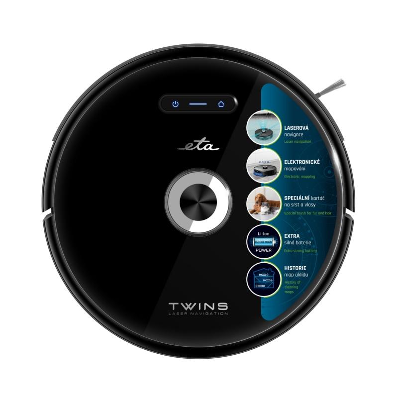 ETA Twins je vybavený skvelou pamäťou. Dokáže si naskenovať a uložiť až 5 máp a je tak ideálny do poschodových domov. V každom poschodí je možné navyše nastaviť aj zakázané zóny, ktorým sa má vyhnúť. Vyberte si z 5 režimov upratovania. Ak sa v vysávač v priebehu upratovania vybije, sám si automaticky vyhľadá nabíjaciu stanicu a po 4 – 6 hodinách bude opäť pripravený na upratanie. Po dobití bude pokračovať presne tam, kde skončil.