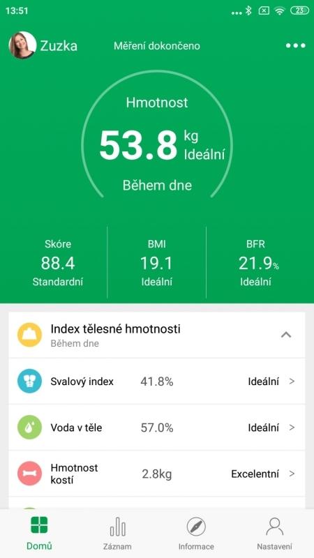 - po spárovaní s váhou zobrazuje, analyzuje, komentuje a ukladá namerané dáta - viac ako 18 rôznych telesných charakteristík (napr. viscerálny tuk, telesný tuk, podkožný tuk, vodu v tele, svalovinu, hodnotenie postavy, stupeň obezity, kosti, BMI alebo informácia, koľko by daná osoba mala vážiť)