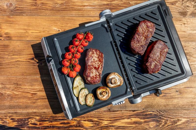 V pohodlí domova si môžete pripraviť vaše obľúbené grilované mäso, ryby, zeleninu, opekané chleby a pečivo. Rozmery každej z 2 grilovacích plôch činia 34 x 24 cm . Ich antiadhézna povrchová úprava pomáha jednoduchšie robiť údržbu. V grilovacích doskách sú integrované tepelné špirály pre rýchlejšie nahriatie a efektívnejší prenos tepla. Súčasťou grilu je tiež odnímateľná teplotná sonda pre sledovanie správnej teploty grilovaného pokrmu.