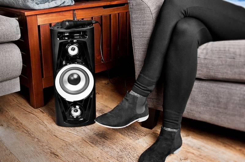 Pripojte k zvukovému systému mikrofón a usporiadajte karaoke párty. Pomocou 6,3 mm jacku môžete reproduktor použiť aj ako zosilňovač k vašej gitare. Navyše majú vstupy pre mikrofón a gitaru možnosť samostatnej regulácie hlasitosti.