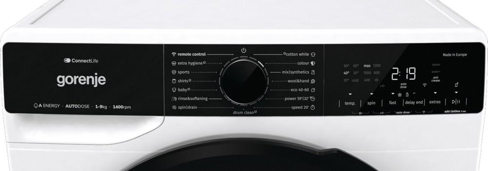 Práčka, Náplň bielizne na pranie 9 kg, Spotreba el. energie/100 cyklov 49 kWh, Úroveň emisií hluku vo fáze odstreďovania dB(A) re 1 pW 76