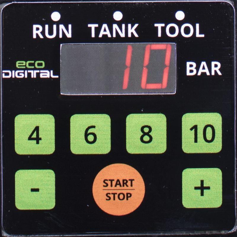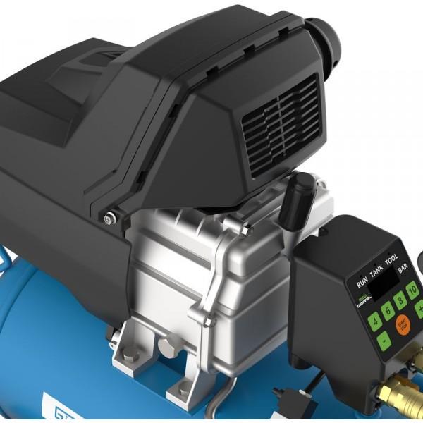Olejom mazaný jednopiestový kompresor, digitálny riadiaci panel, priamy pohon, nastaviteľný pracovný a odpájací tlak, digitálny ukazovateľ tlaku, 2 tlakové spojky...
