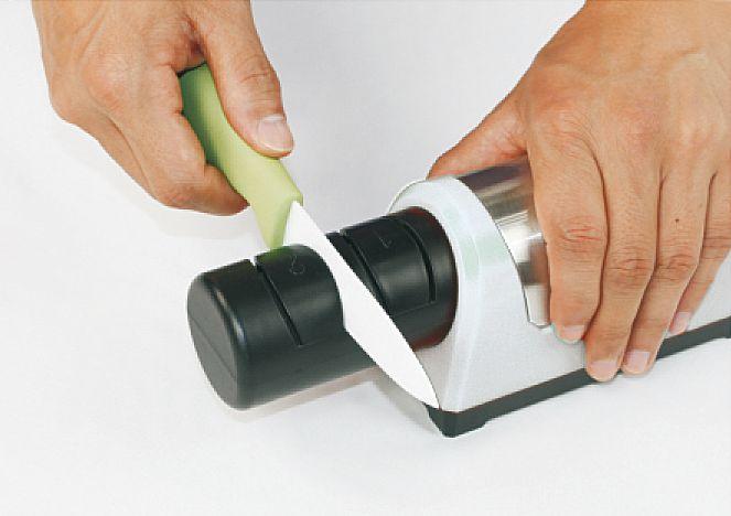 Brúska na nože, Elektrická diamantová brúska je určená na brúsenie oceľových aj keramických nožov., 4 diamantové brusné kotúče zaručujú efektívne a kvalitné brúsenie na dlhýčas., Správnyuhol a rovnomerný tlak vytvarujú perfektné ostrie.
