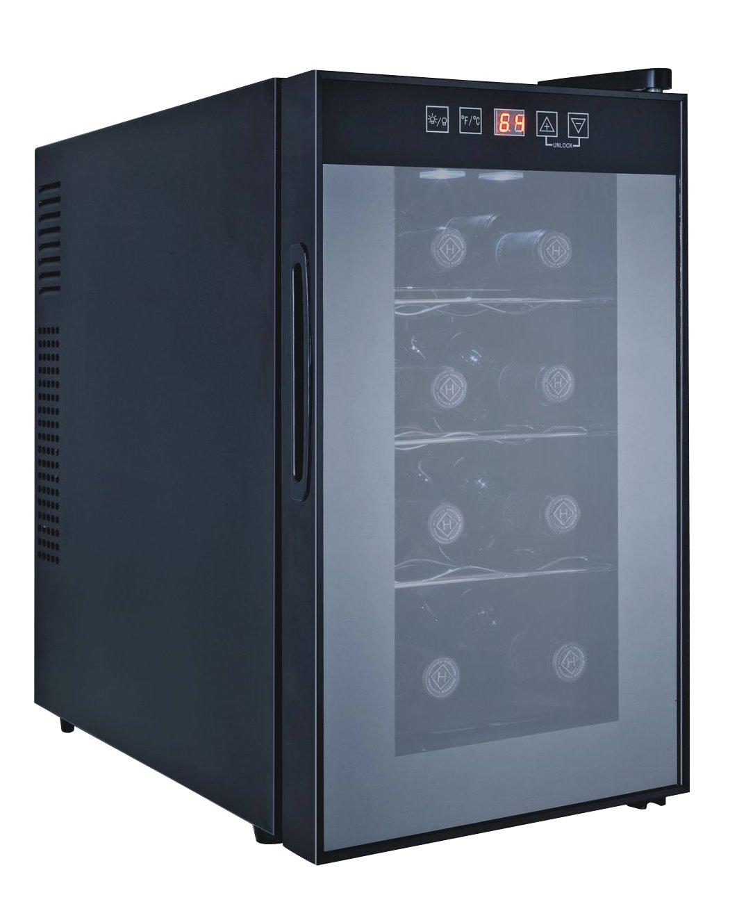 Voľne stojaca vinotéka Guzzanti GZ 08 v elegantnom čiernom prevedení s čiernym interiérom a modrým LED osvetlením, s dvierkami z temperovaného zrkadlového skla. Disponuje objemom 23 l a je určená pre 8 fliaš vína.