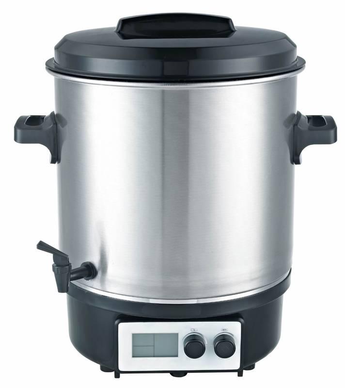 Plne automatický zavárací hrniec s LCD displayom. Použiteľný tiež ako automat na varené víno. Objem 27 l, umožňuje zaváranie 14 až 18 zaváracích pohárov súčasne. Plynule nastaviteľný termostat v rozsahu 30 - 100°C. Ochrana proti prehriatiu. Automat. časový spínač až na 120 minút (automaticky sa vypne) alebo nepretržitý chod. Vstavaný výpustný kohútik umožňuje ľahké vypúšťanie vody a je vhodný aj pre stáčanie horúcich nápojov napr. vareného vína, čaju či punču. Možnosť prípravy polievok a gulášov, možno použiť na tavenie vosku. Dvojvrstvový a ľahko čistiteľný nerezovým plášť, tepelne izolované rukoväte.