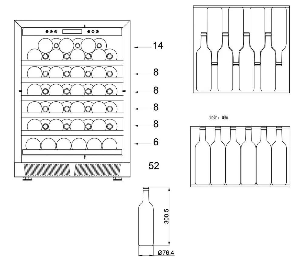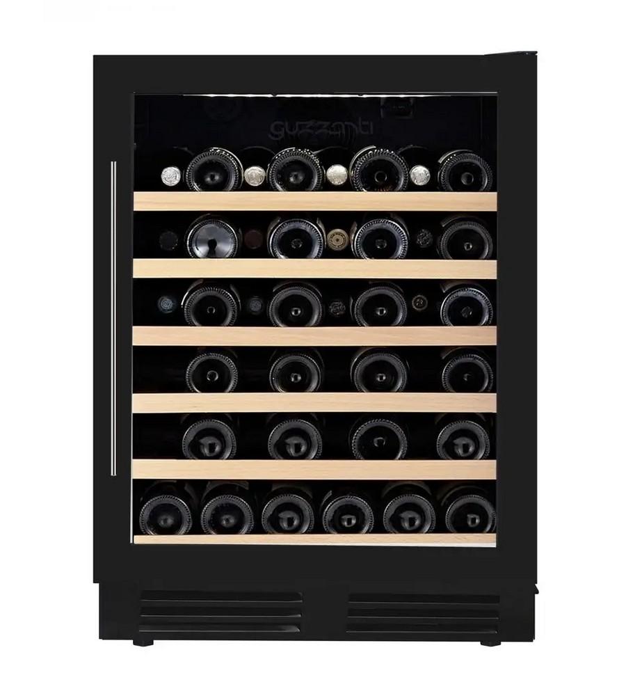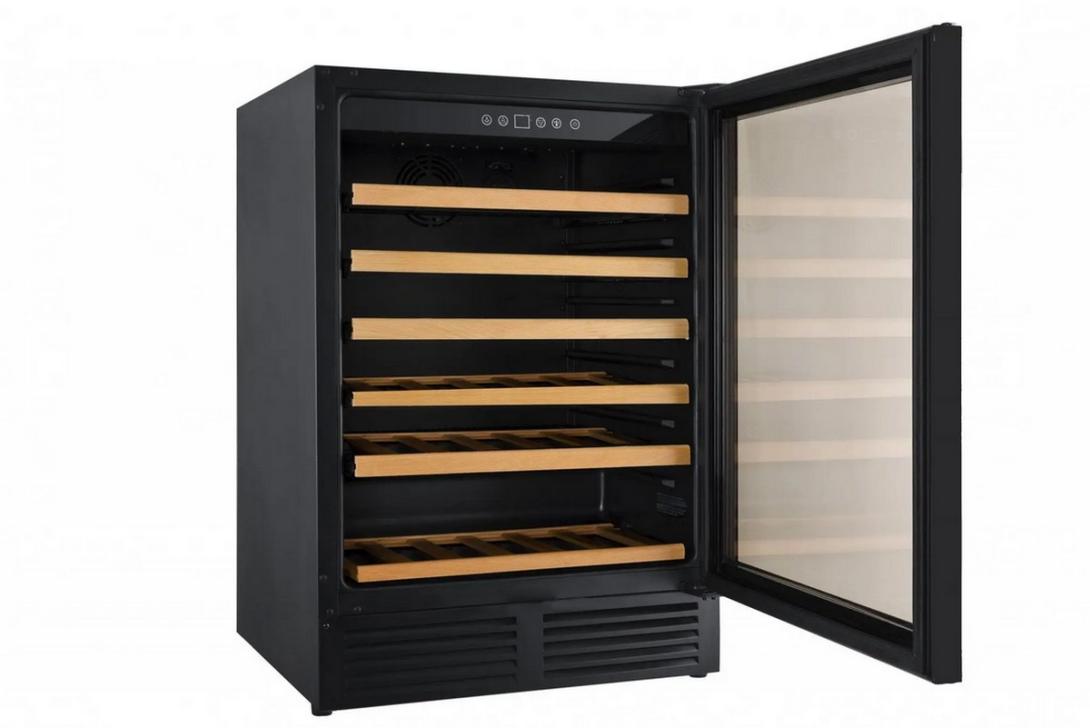 Voľne stojaca vinotéka v čiernom dizajne, Možnosť uskladnenie až 52 fliaš vína (145 l), Teplota nastaviteľná od 5 do 12 °C, 6 drevených (bukových) políc, Digitálny displej, Vnútorné LED osvetlenie, Prepínač zobrazovania teploty ~C/F, Rukoväť z nerezovej ocele.