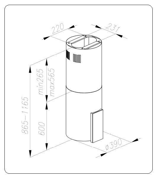Ostrovčekový komínový odsávač pár, LED osvetlenie 4 x 3W, Rozmery (V x Š x H): 86,5-116,5 x Ø39 cm