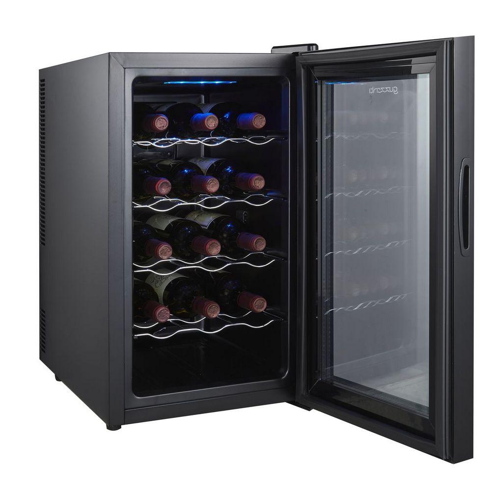 Vinotéka, kapacita 15 fliaš, 48l netto, 4 chrómové drôtené police, LED display + termostat s digitálnym ukazovateľom teploty, spotreba 0,25kWh/24