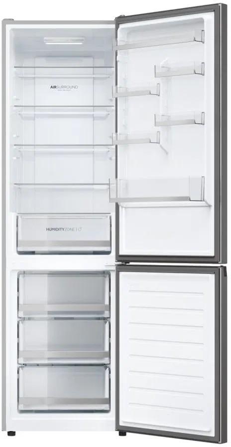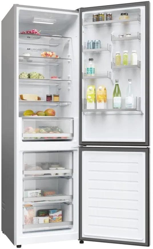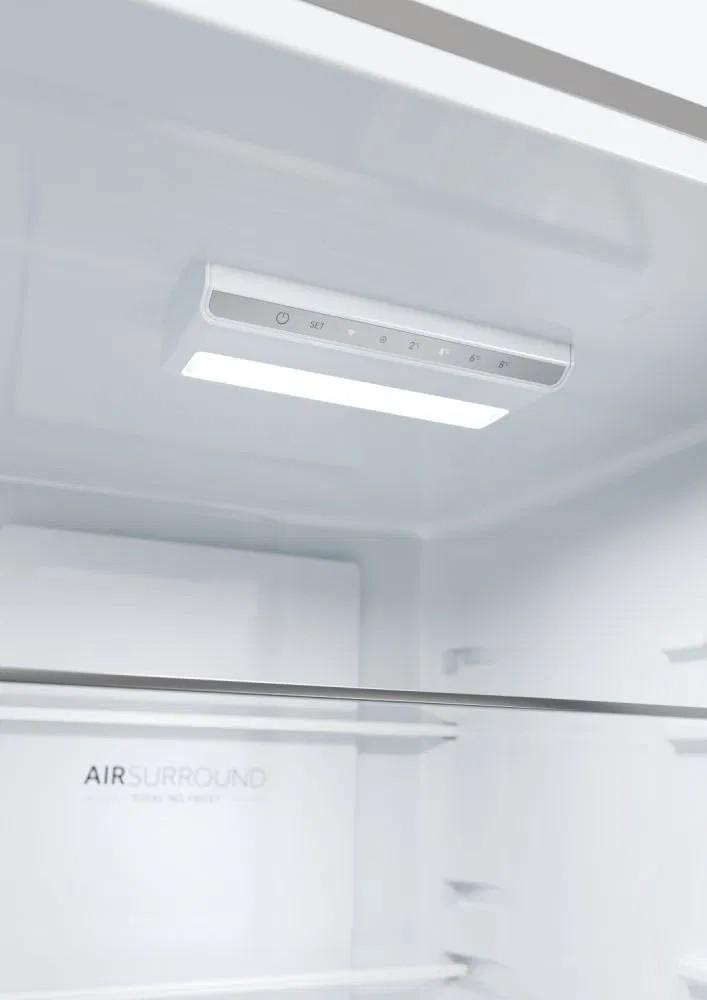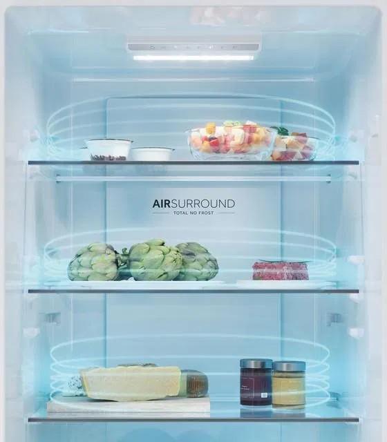 S beznámrazovou technológiou Haier Air Surround Fresher Tech prúdi vzduch vo vnútri chladničky jemnejším a šetrnejším spôsobom. Vďaka špeciálnym bočným vývodom na zadnej stene tento systém distribuuje studený vzduch homogénne v kruhoch v celom priestore chladničky. Tým bráni priamemu prúdeniu na potraviny a strate hmotnosti a vysušeniu. To je dôvod, prečo si potraviny skladované s Haier Air Surround zachovávajú chuť, konzistenciu a šťavnatosť jedla až o 99 %* po 7 dňoch ako prvý deň.