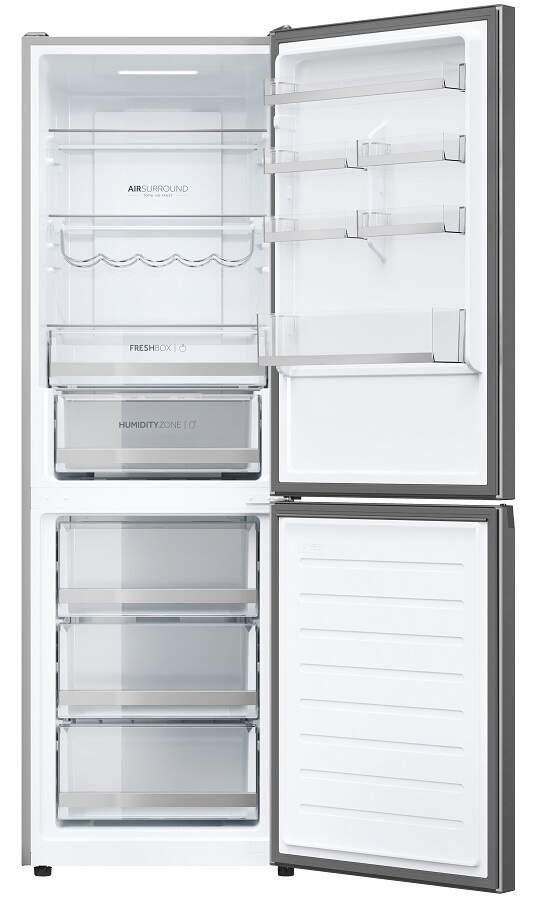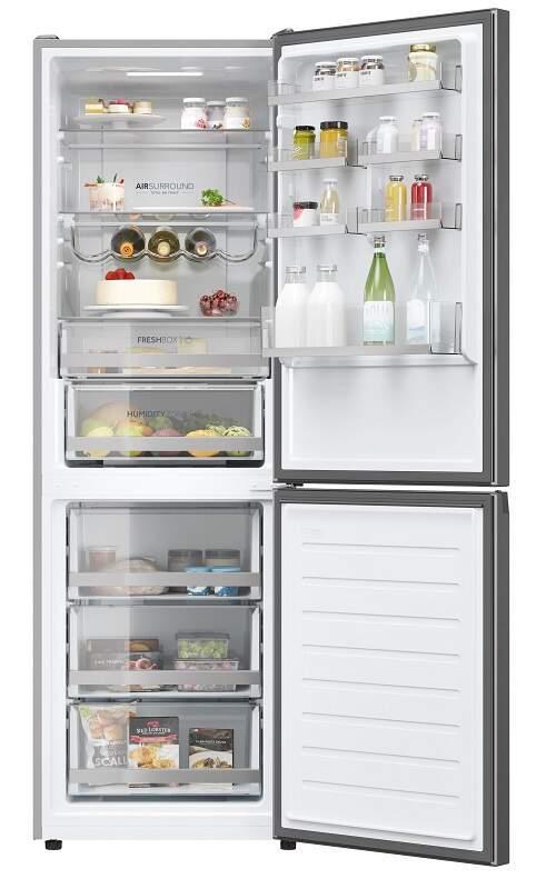 S beznámrazovou technológiou Haier Air Surround Fresher Tech prúdi vzduch vo vnútri chladničky jemnejším a šetrnejším spôsobom. Vďaka špeciálnym bočným vývodom na zadnej stene tento systém distribuuje studený vzduch homogénne v kruhoch v celom priestore chladničky. Tým bráni priamemu prúdeniu na potraviny a strate hmotnosti a vysušeniu. To je dôvod, prečo si potraviny skladované s Haier Air Surround zachovávajú chuť, konzistenciu a šťavnatosť jedla až o 99 %* po 7 dňoch ako prvý deň.