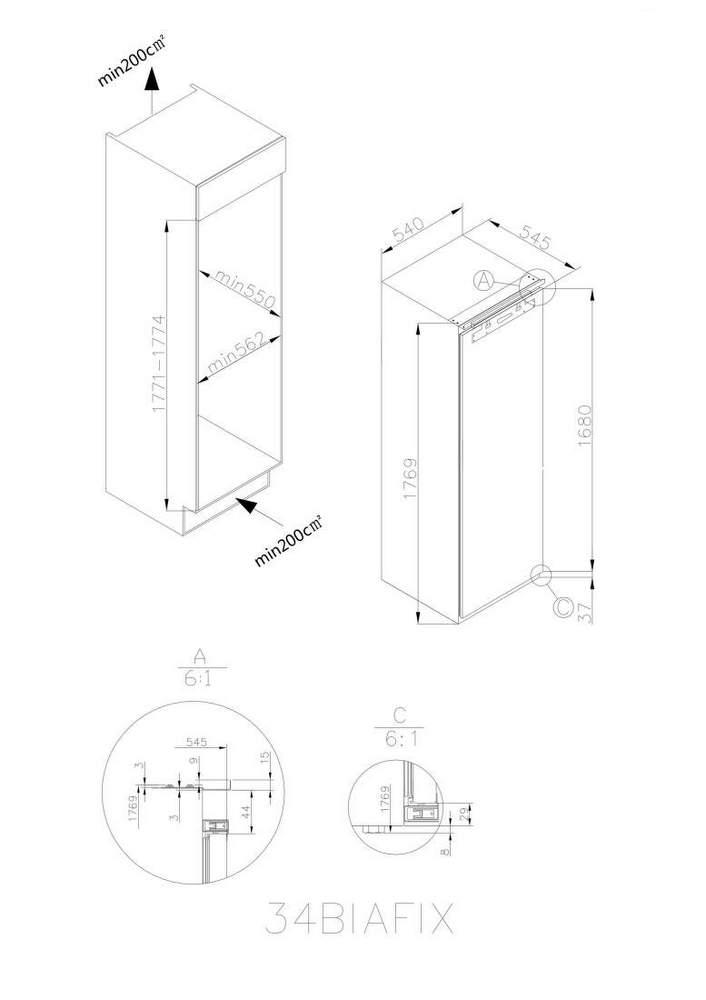 Vstavaná mraznička, Celkový čistý objem 200 L, Ročná spotreba energie 289 kWh, Klimatická trieda ST, Maximálna hlučnosť 41 dB