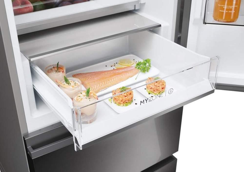 Chladničky Haier 3D 60 Series 5 so šírkou 60 cm sa vyznačujú pôsobivo navrhnutým systémom zásuviek v mrazničke, ktorý umožňuje nielen efektívnejšie využívať priestor pre mrazené potraviny, ale tiež zaisťuje rýchly prístup k celej mrazničke, čím sa ušetrí až o 30 % viac energie podobných chladničiek s mrazničkou umiestnenou dole. Technológie Fresher Techs® zároveň neustále upravujú podmienky, aby bolo zaručené zachovanie kvality potravín. Chladničky Haier 3D 60 Series 5 dokonale uchovajú potraviny dlhšie čerstvé aj vďaka špeciálnym zónam, ktoré regulujú teplotu a/alebo vlhkosť..