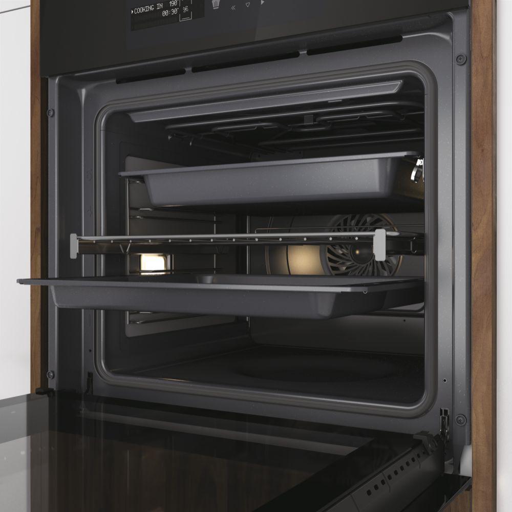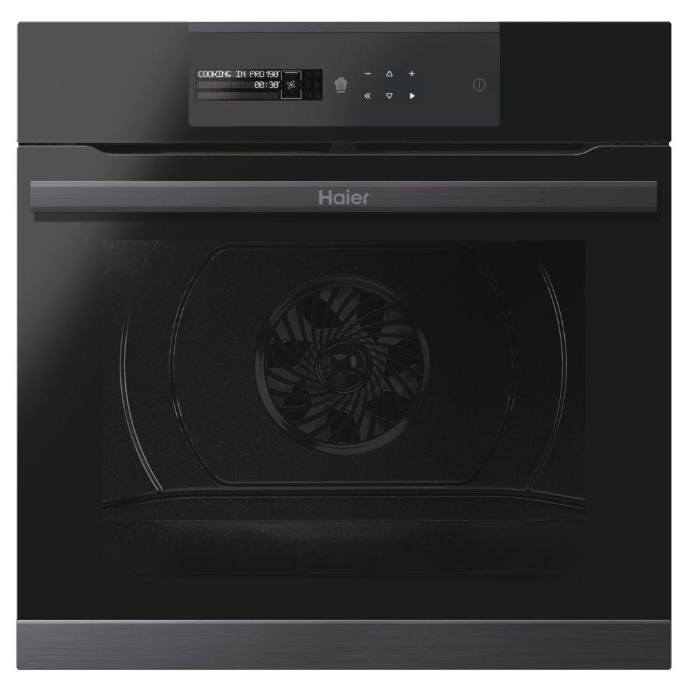 Vstavaná rúra, Rúra Haier s pripojením, konektivitou, s povrchom z tmavej nerezovej ocele, elegantným čiernym sklom a s veľkým displejom pre digitálne správy.