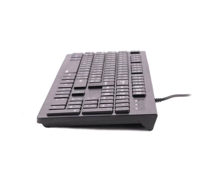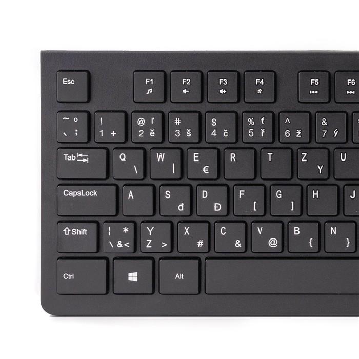 Klávesnica, spoľahlivá robustná s klasickým rozložením kláves pre všetky PC, ochrana proti striekjajúcej vode s odtokovými otvormi, nastaviteľná výška klávesnice, mediálne funkcie (pomocou klávesu FN), plochý dizajn, klávesy s nízkym zdvihom, plnoformátové usporiadanie.