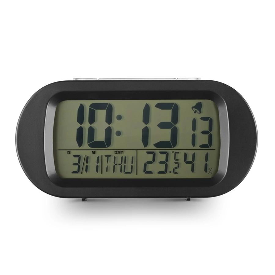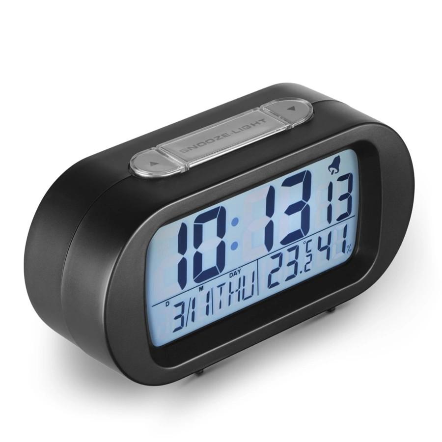 Digitálny budík so zobrazením času, času budenia, dátumu, teploty a vlhkosti vzduchu, rozmery (Š x H x V): 13,8 x 4,3 x 6,7 cm