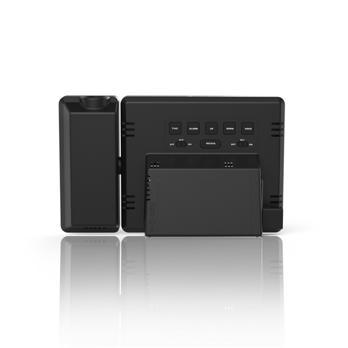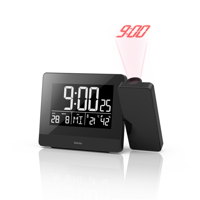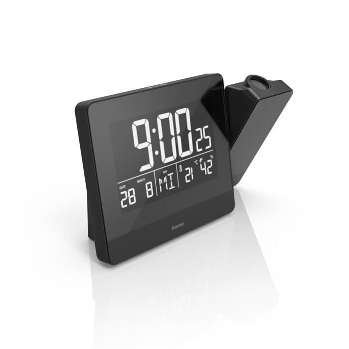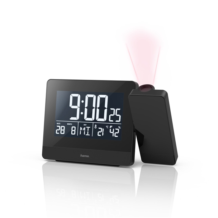 Rádiobudík, digitálny budík riadený rádiovým signálom DCF, projekcia času na stenu alebo strop; možnosť otočenia o 0°, 90°, 180°, alebo 360°