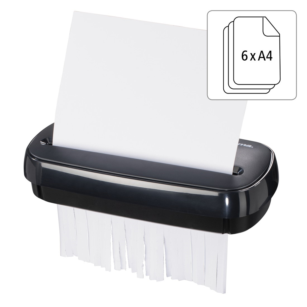 Skartovačka, skartovanie 6 hárkov papiera DIN A4 (80 g/m2) naraz, kapacita (papier): 8 l, max. rýchlosť skartovania: 2,8 m/min., max. úroveň hluku: 70 dB, max. nepretržitá prevádzka: 2 minúty