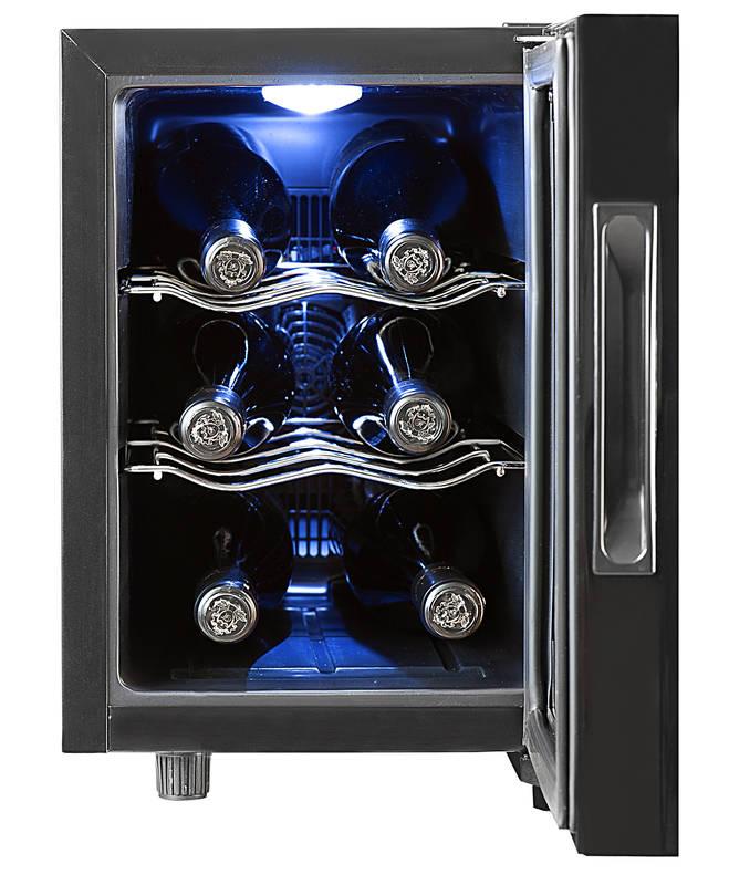 Vinotéka jednozónová, príkon 50 W, objem 16 l, kapacita 6 fliaš, dotykové ovládanie, LED displej a osvetlenie, hlučnosť 38 dB(A), ener.trieda A, farba: čierna