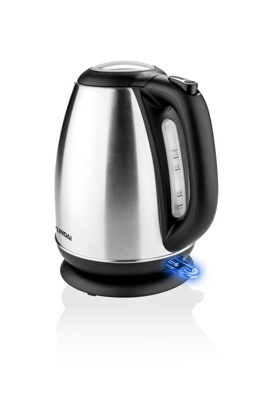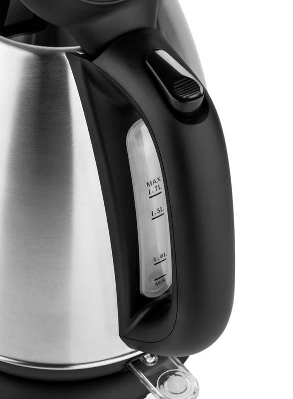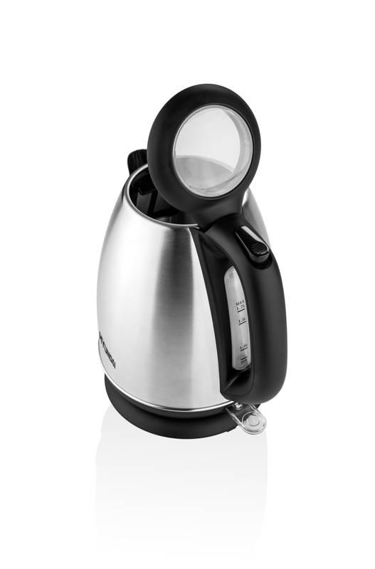 Nerezová rýchlovarná kanvica, príkon 2200 W, objem 1,7 l, vyberateľné sitko, výklopné veko ovládané tlačidlom v držadle, vodoznak v zadnej časti kanvice, farba: nerez