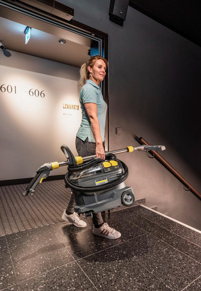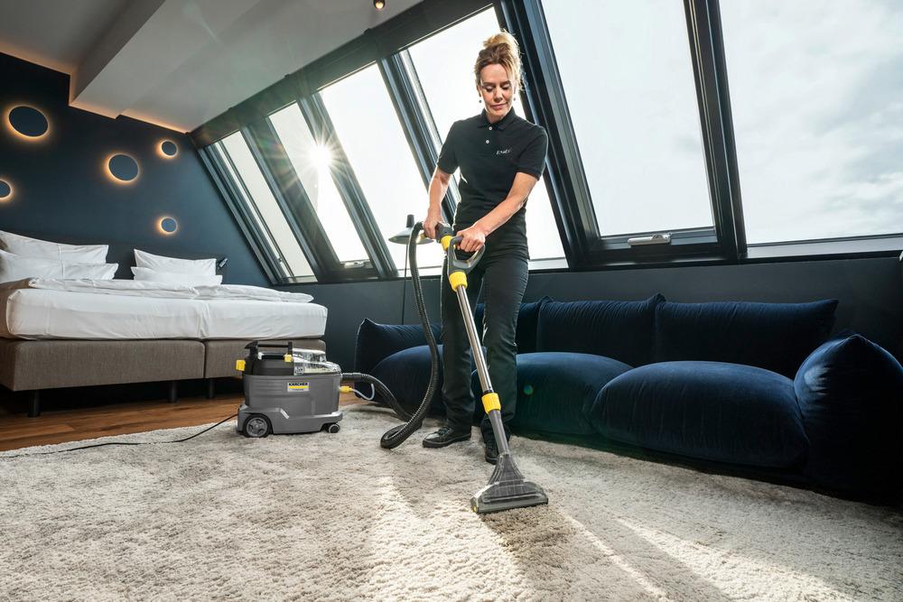 S 240 mm kobercovou hubicou a krátkou hubicou na čalúnenie v štandardnej výbave – sprejový čistič Puzzi 8/1 Adv je určený na mimoriadne rýchle a dôkladné čistenie čalúnenia a kobercov. Vďaka vynikajúcemu výkonu spätného nasávania poskytuje profesionálny tepovač Puzzi 8/1 Adv od spoločnosti Kärcher vynikajúce a hygienické výsledky čistenia a zaisťuje, že textilné povrchy sa dajú opäť rýchlo použiť. Na tento účel rozprašovací stroj nastrieka čistiaci roztok hlboko do textilných vlákien a potom ho znova odstráni uvoľnenými nečistotami, vďaka čomu je ideálny na čistenie čalúnenia, kobercov a iných textilných povrchov. Jeho robustný a kompaktný dizajn zaisťuje dlhú životnosť, a tým aj vysokú nákladovú efektívnosť – ideálny pre dodávateľov stavebných služieb, hotelový a pohostinský sektor alebo na čistenie interiérov vozidiel. Veko spotrebiča, ručná hubica a podlahová hubica sú priehľadné pre lepší výhľad na špinavú vodu. Kontrolné okienko na rukoväti ďalej zvyšuje možnosti monitorovania. Nízka hmotnosť Puzzi 8/1 Adv a ergonomická rukoväť umožňujú jeho prepravu jednou rukou. Veľké tlačidlá, ktoré je možné ovládať rukou alebo nohou, tiež zvyšujú pohodlie používateľa.