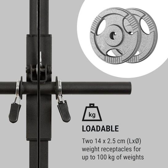 - Zaťažiteľná: dva držiaky na závažia s rozmermi 14 x 2,5 cm (D x Ø) až do hmotnosti 100 kg