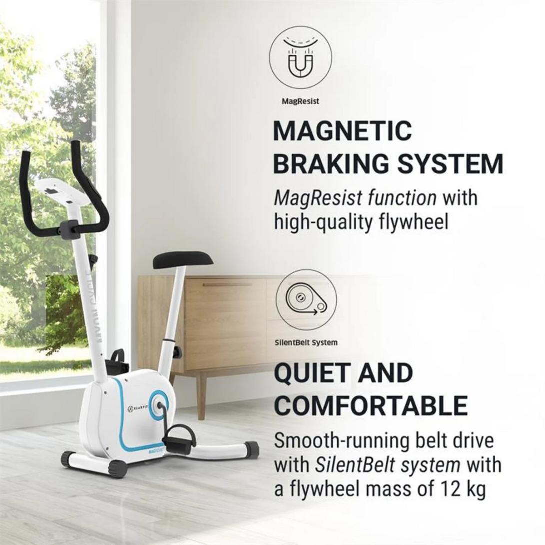 Vďaka veľmi kvalitnému remeňovému pohonu so systémom SilentBelt pracuje domáci trenažér s maximálnou nosnosťou 100 kg veľmi plynulo a potichu. Ideálnu silu nástupu zabezpečuje odpor s celkovo 8 úrovňami, ktorý zaručuje efektívny tréning vďaka rozličným úrovniam. Magnetický brzdový systém s funkciou MagResist zaujme presným a spoľahlivým procesom brzdenia, ktorý je okrem toho mimoriadne šetrný k materiálu. Výškovo nastaviteľné sedlo Vás vždy uvedie do správnej polohy pre sústredený a náročný tréning. V pohodlných držadlách je zabudovaný pulzný monitor, ktorý poskytuje tréningovému počítaču aktuálne dáta o pulzovej frekvencii, čo umožňuje efektívnu kontrolu výkonu.