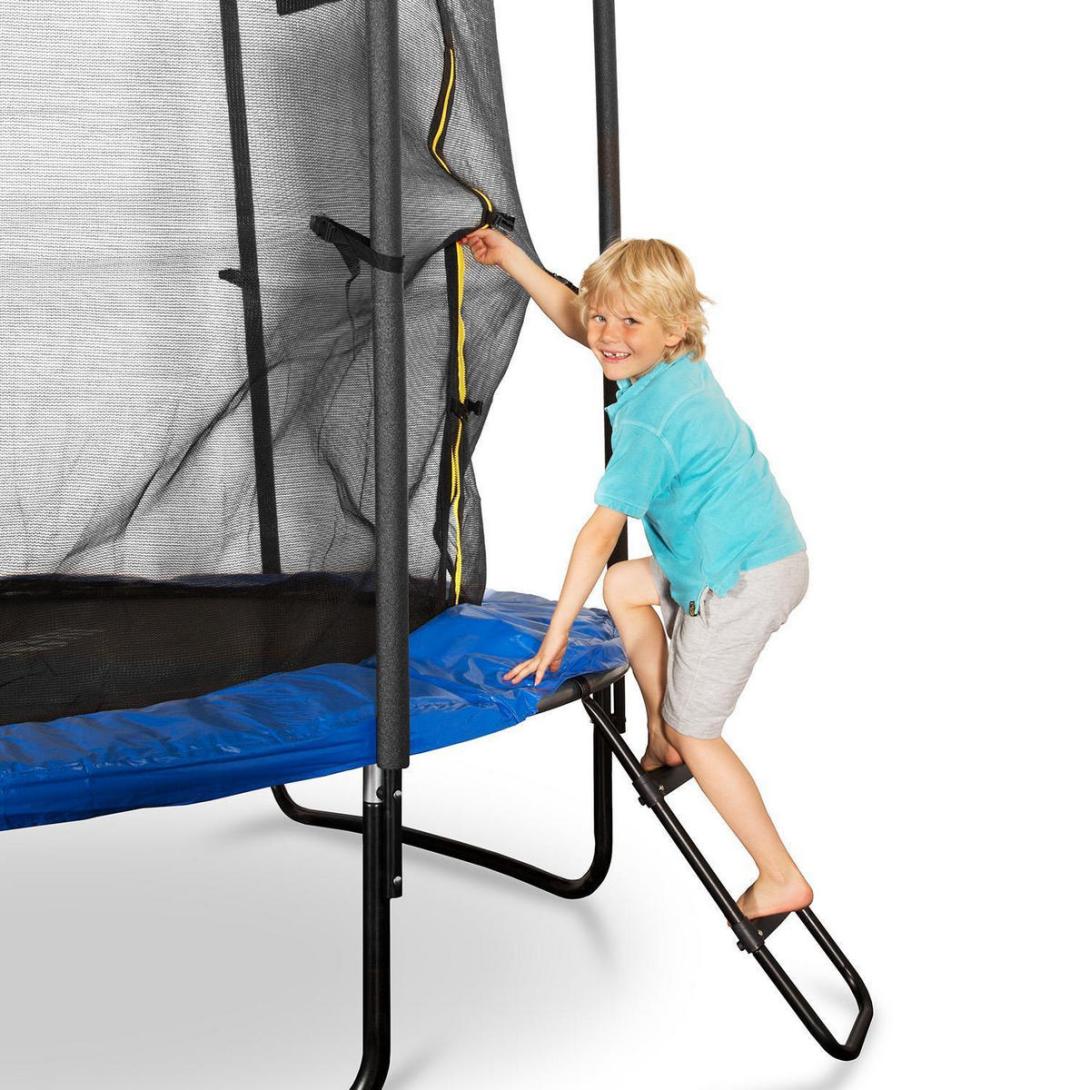Pre zariadenie Rocketboy 250 prepracoval a zlepšil Klarstein osvedčený dizajn svojich trampolín. V popredí stála predovšetkým bezpečnosť používateľov. Pozdvihnúť treba predovšetkým nový vstupný rebrík, ktorého priečky boli nahradené protišmykovými plastovými schodíkmi. Tieto sa na slnku menej zohrievajú a ponúkajú so svojou hladkou, protišmykovou plochou príjemný a bezpečný vstup na trampolínu. Tri dvojité nohy sa starajú o pevné a stabilné umiestnenie, pričom špeciálna konštrukcia stabilitu zvyšuje. Základným predpokladom je však v každom prípade rovný podklad. Voliteľná bezpečnostná sieť je odolná a ponúka dodatočnú ochranu pred zraneniami. V protiklade k mnohým porovnateľným produktom je sieť zariadenia Rocketboy od Klarstein pripevnená zvnútra, vďaka čomu nemožno z trampolíny spadnúť alebo sa dostať do kontaktu s pružinami. Držadlá siete sú samozrejme polstrované.