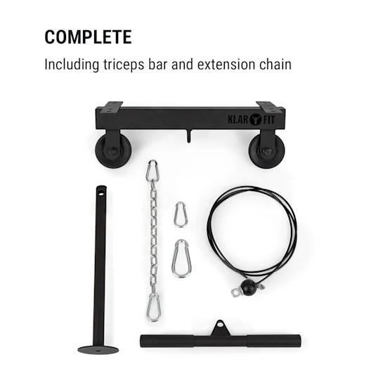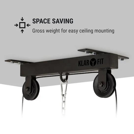 Poďme ihneď na to: aby bol Klarfit Hangman Ceiling Lat Pull ihneď pripravený na použitie sa v balení nachádza 35 cm tricepsová tyč a 30 cm predlžovacia reťaz. Zariadenie upevníte na strop pomocou zápustných kolíkov a skrutiek s vysokou nosnosťou, ktoré sú súčasťou balenia.