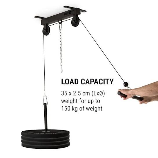 Precvičené ramenné, brušné a chrbtové svaly v priestorovo úspornom domácom štúdiu - s Klarfit Hangman kladkou to nie je žiaden problém. Masívne tréningové zariadenie vyrobené z ocele s práškovým lakovaním zaskrutkujete veľmi jednoducho na strop a zaberá pritom značne menej miesta ako iná kladková stanica. Úchyt na závažia (dĺžka 35 cm, priemer 2,5 cm) udrží až 150 kg. Individuálny tréning tak vždy má to správne zaťaženie a postará sa o najlepšie definované svaly celej hornej časti tela. Aby Váš workout nerušil spolubývajúcich či susedov sú kolieska 2m dlhého kladkového kábla vybavené obzvlášť vysokokvalitnými guľôčkovými ložiskami, ktoré sa postarajú o tichý a čistý chod kladkového lana.