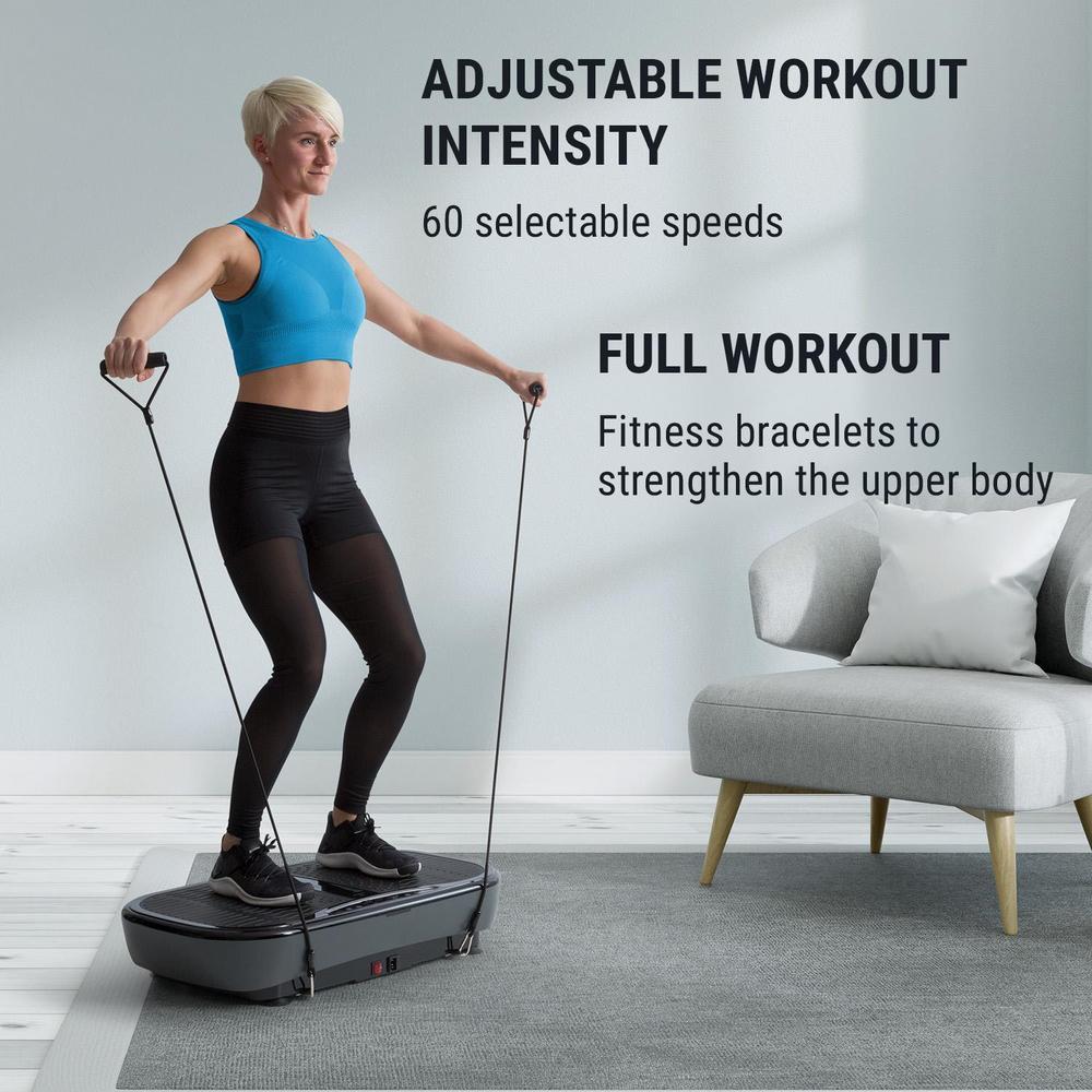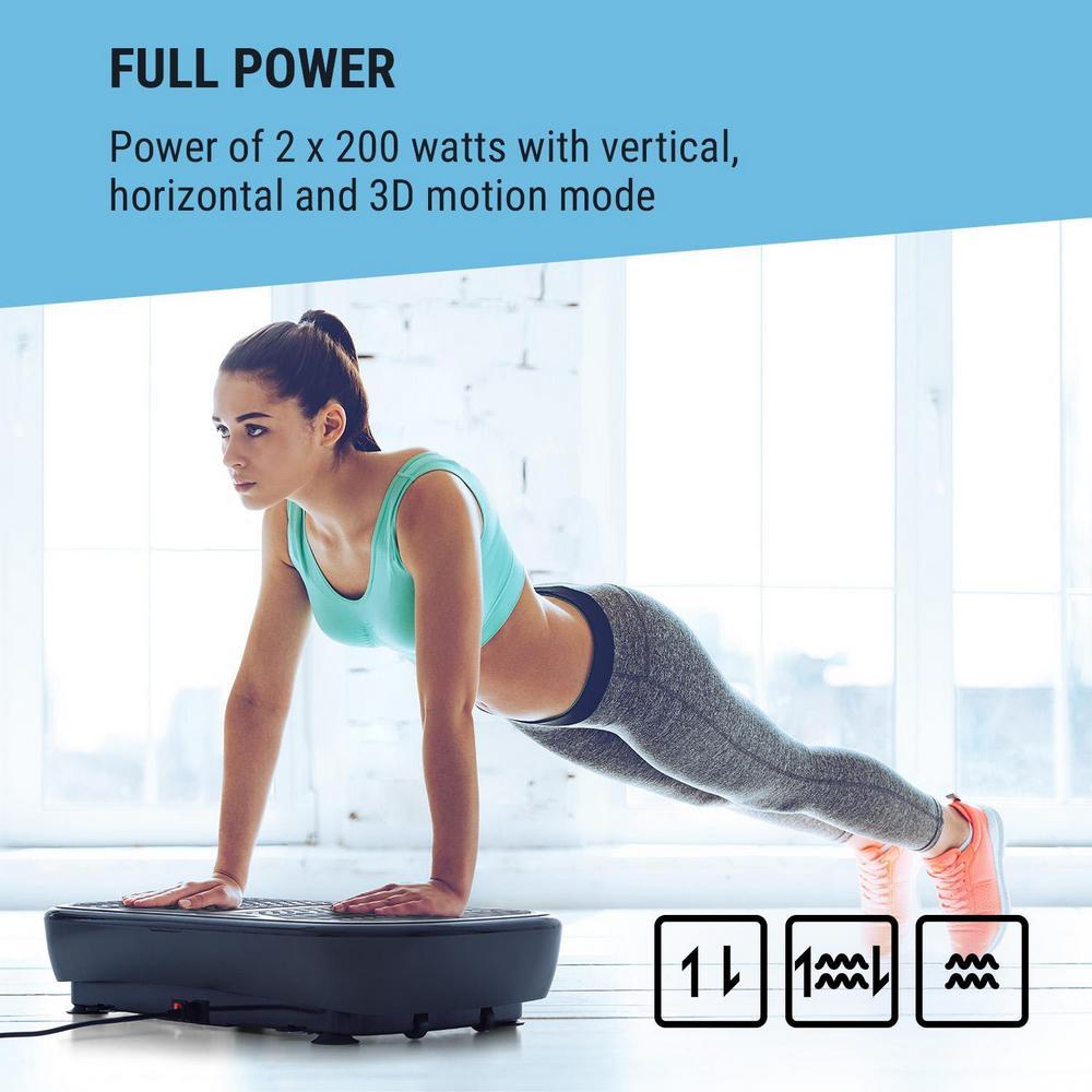 Vibračný workout s 3 pohybovými režimami, 60 rýchlosťami a 4 vopred nastavenými programami aktivuje rôzne zóny tela bez zaťažovania väzov a kĺbov. Vzpriamené držanie tela vyžaduje predovšetkým posilnenie chrbtových a panvových svalov a navyše podporuje správny spôsob chôdze. Tieto cvičenia účinne precvičia aj nepoužívané svalové skupiny vo vnútri tela. Vibračná plošina slúži nielen na budovanie svalov, je tiež vynikajúca na spevnenie kože a spojivových tkanív, pomáha redukovať celulitídu a znížiť množstvo telesného tuku. Precvičuje sa aj krvný obeh a rastie celková pohyblivosť.