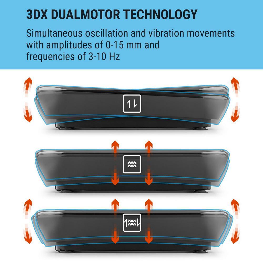 Okrem horizontálneho a vertikálneho pohybu má vibračná plošina k dispozícii aj režim, ktorý zjednocuje oba tieto pohyby: pomocou technológie 3DX Double Motor Technology sa dá aktivovať 3D režim s hĺbkovo účinným rotačným pohybom. Športové zariadenie pri tom dosahuje amplitúdu kmitania 0 - 10 mm a amplitúdu špirály 0 - 15 mm ako aj frekvenciu kmitania 5 - 10 Hz a lineárnu frekvenciu 3 - 10 Hz. Ďalšou špecialitou je kniha Klarstein „Fit & Healthy", ktorá ponúka vynikajúce fitness recepty na doplnenie každodenných tréningov.
