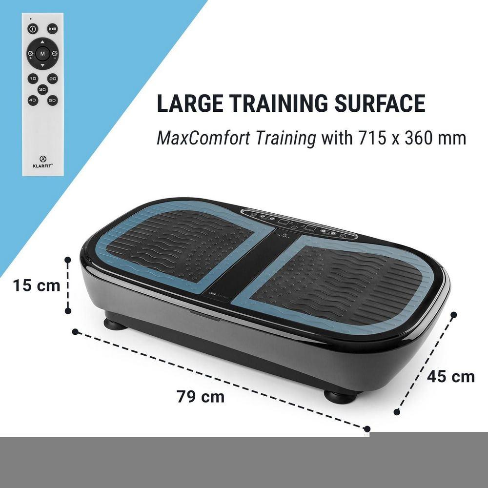 Všestranné variácie tréningu sa dajú uskutočňovať pomocou funkcie MaxComfort Training a na veľkej tréningovej ploche vibračnej plošiny KLARFIT Vibe 3DX Pro s rozmerom 71,5 x 36 cm sa dá cvičiť voliteľne v stoji, v sede alebo v ľahu. Dva dodávané fitness pásy umožňujú navyše množstvo strečových cvikov a sú obzvlášť vhodné na rôzne tréningové využitie, predovšetkým sú určené na posilnenie hornej časti tela. Dodávaný diaľkový ovládač v každom čase garantuje pohodlné ovládanie bez otravného zostupovania.