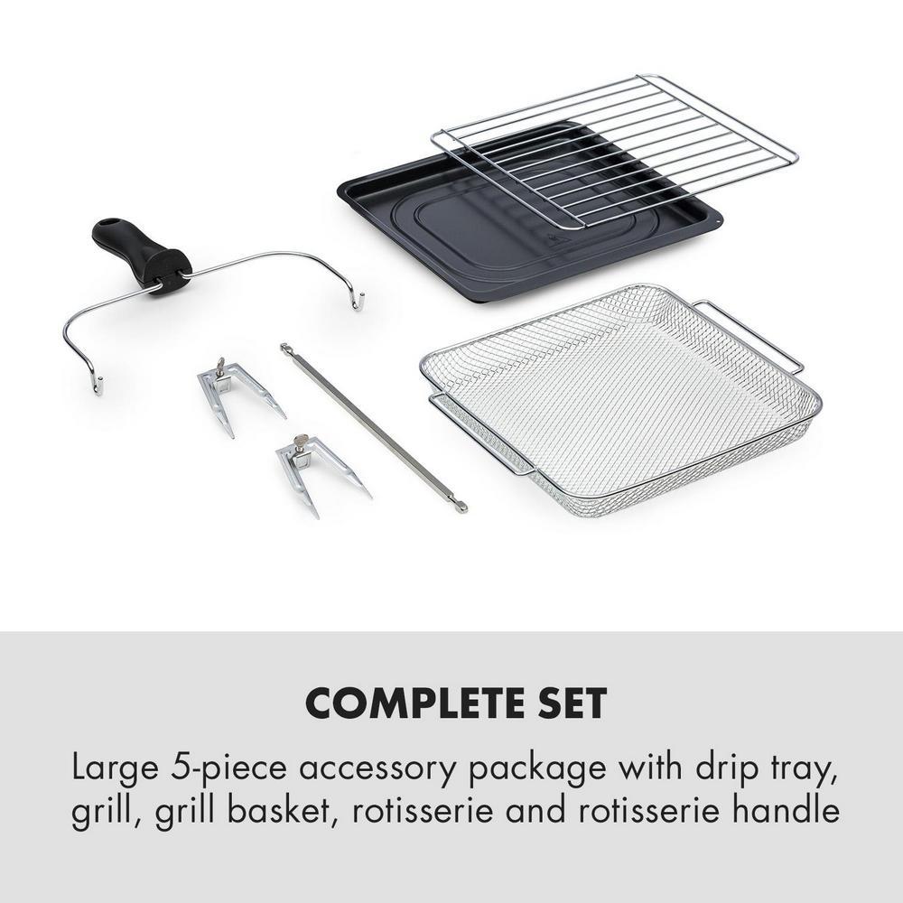 Veľký vnútorný XXL priestor s kapacitou obrovských 12 l len ťažko nesplní nejaké želanie na prípravu jedla a pojme dokonca aj celé grilované kurča. Pritom je teplovzdušná fritéza Klarstein AeroVital Cube vďaka svojmu dizajnu mini rúry obzvlášť kompaktná a nezaberá viac miesta ako obyčajná fritéza. Rozsiahla súprava príslušenstva je optimálne vybavená na všetky účely: miska na zachytávanie vystupujúceho tuku, grilovací rošt a kôš na grilovanie veľkých a malých jedál ako sú kuracie krídelka alebo krokety a špíz na ražničí s prislúchajúcim zdvihákom k nej taktiež patria ako aj 360° 3D grilovacia klietka, v ktorej sa hranolky otáčaním špízu rovnomerne zo všetkých strán upečú do chrumkava. A to najlepšie je: tu môžeme fritovať podľa nálady a chuti, bez toho aby sme sa starali o kalórie, pretože všetko sa pečie pomocou horúceho vzduchu úplne bez pridania oleja.