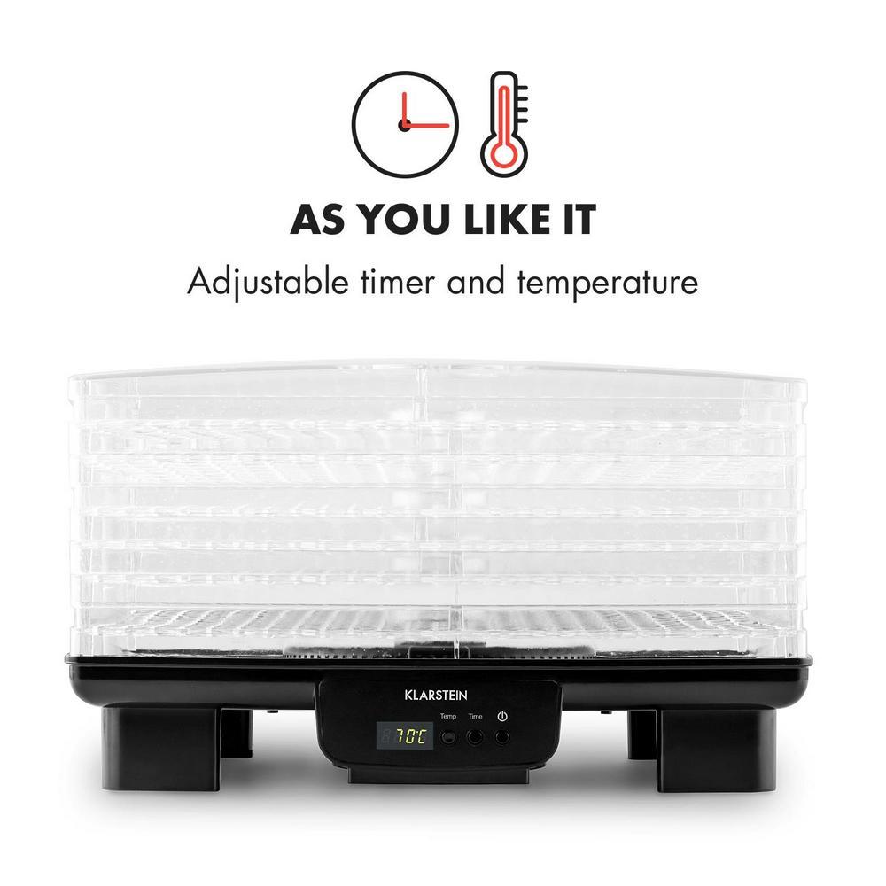 Výkonný dehydrátor od spoločnosti Klarstein vysuší v rekordnom čase ovocie, zeleninu, mäso a ďalšie potraviny a tým vytvára vynikajúce, trvanlivé občerstvenia a prísady. Či už na vitamíny bohaté sušené ovocie ako jablkové alebo banánové čipsy, alebo zdravú zeleninu ako sušené paradajky- zariadenie Klarstein Bananarama hravo poslúži všetkým chutiam. S vykurovacím výkonom 550 W sa sušička postará o to, že v potravinách neostane žiadna voda. Kompletné sušenie predlžuje trvanlivosť potravín prirodzeným spôsobom pri zachovaní vitamínov, vlákniny a ďalších hodnotných zložiek bez strát. Celkom ako pri Paleo strave ide o druhovú výživu s množstvom zeleniny, kvalitných živočíšnych produktov a ovocia a výživu k štíhlosti, výkonnosti a nadpriemernému zdraviu. Výkonný motor výrazne skracuje dobu sušenia v porovnaní s inými dehydrátormi bez straty kvality. Pre flexibilnú prípravu rôznych potravín sa dá teplota sušičky nastaviť od 40 do 70 °C. Integrovaný časovač zjednodušuje používanie a ukončí sám od seba proces sušenia v požadovanom čase.