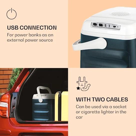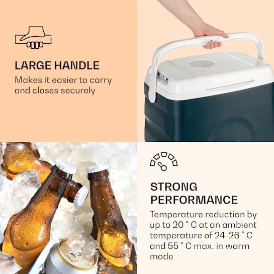 Autochladnička, 29 litrov: veľký vnútorný objem, Peltierov článok s △T 18 – 20 °C pri teplote okolia 24 – 26 °C, jednoduché ovládanie