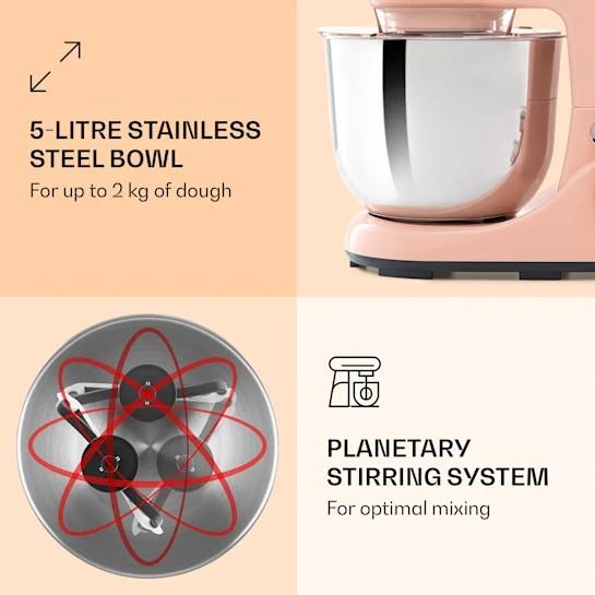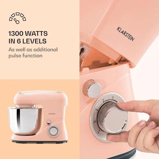 Kuchynský robot Klarstein Bella Pico 2G má mixovaciu nádobu s objemom 5 litrov a mimoriadne výkonný motor. Vďaka 6 nastaveniam rýchlosti a pulznej funkcii je ideálny pre všetky požiadavky na pečenie. Súčasťou balenia je hnetaí hák na cesto a miešací hák z vysokokvalitného tlakovo liateho hliníka a šľahač z nehrdzavejúcej ocele. Vďaka svojmu kompaktnému, krásne navrhnutému puzdru zaberá mixér Klarstein Bella Pico 2G nielen veľmi málo miesta, ale v kuchyni aj dobre vyzerá.