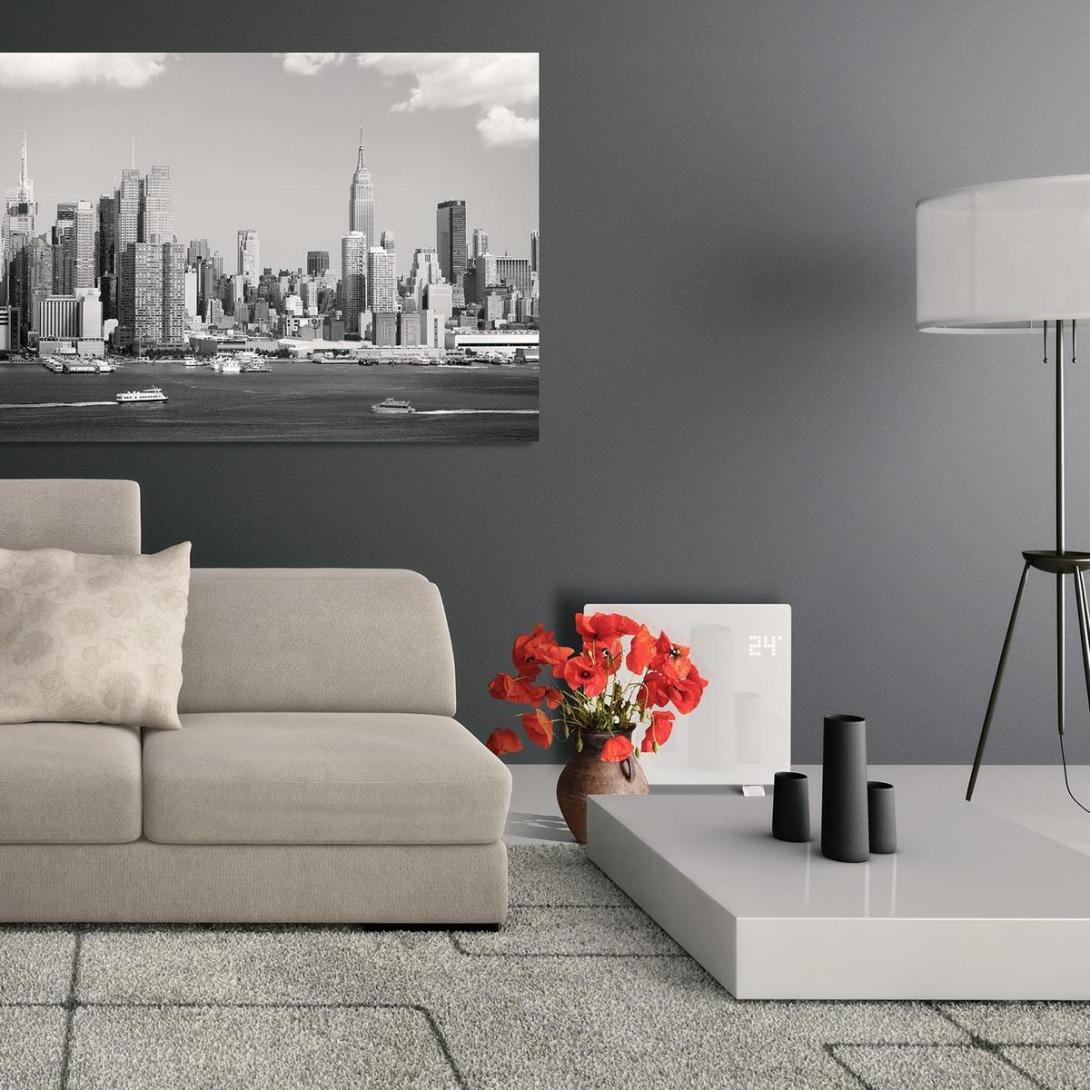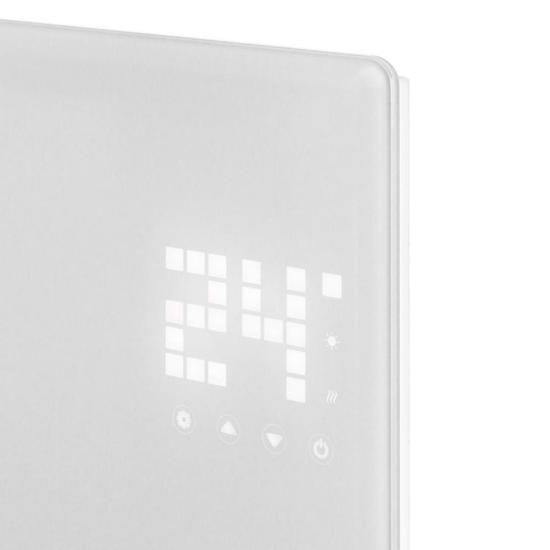 Na dotykovom displeji v pravom hornom rohu skleneného panela ľahko nastavíte požadované funkcie ohrievača. Displej taktiež zobrazuje aj izbovú teplotu. Diaľkový ovládač slúži na pohodlné ovládanie ohrievača, keď ste pohodlne zababušený/á v kresle.