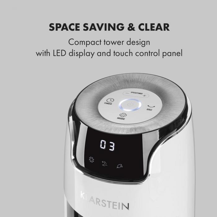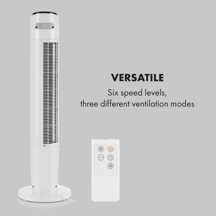 Sila vetra 6: Klarstein Empire State vežový stojaci ventilátor má hneď šesť rýchlostných stupňov, ktoré splnia každé prianie čerstvého vzduchu od jemného vánku až po silné prúdenie. Ventilátor pracuje vďaka novému dizajnu kanála vzduchového prúdu o 36% účinnejšie ako porovnateľné staršie prístroje. Vežový ventilátor sa dostane stlačením tlačidla do 45° oscilácie. Máte na výber tri rôzne režimy ventilácie - okrem bežného režimu aj režim prirodzeného vzduchu a funkcia režimu uspania. Nastaviteľný časovač môžete použiť na automatické zapnutie a vypnutie po 0,5 až 12 hodinách. Klarstein Empire State vežový ventilátor môžete obsluhovať cez zrozumiteľné dotykové ovládacie pole na vrchnej strane alebo úplne pohodlne prostredníctvom dodávaného diaľkového ovládania. Veľký LED displej zobrazuje nastavené parametre a režimy cez zrozumiteľné piktogramy.