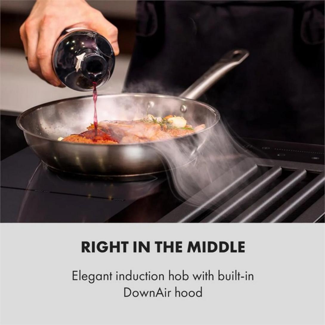 DownAir systém Klarstein Full House je revolúciou v kuchyni, pretože kombinuje indukčnú varnú doskupriamo s DownAir odsávačom pár. Kuchynská para a pachy zmiznú priamo tam, kde vznikajú. Systém využíva najmodernejšie technológie, ako sú VarioHeating pre prevádzku flexi zón, dotykový ovládací panel SenseControl či výkonný ThermoBoost, a kombinuje ich v dizajne PureAmbience s elegantným povrchom z čierneho skla.