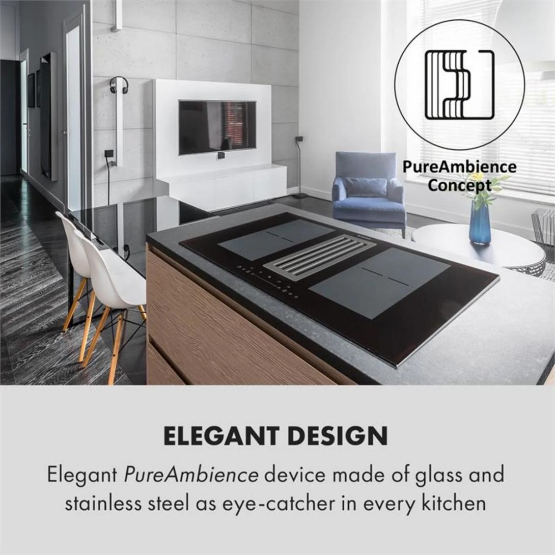 Ako sa na kompletný systém patrí, odsávač pár aj varná doska sa ovládajú spoločne cez dotykový ovládací panel SenseControl. Výkon varných plôch aj odsávací výkon sa dajú veľmi ľahko nastaviť posunutím prsta po dotykovej ploche. Podľa princípu PureAmbience sú všetky ovládacie prvky integrované priamo do čiernej sklenenej plochy, takže žiadne tlačidlá nenarúšajú bezchybný vzhľad.