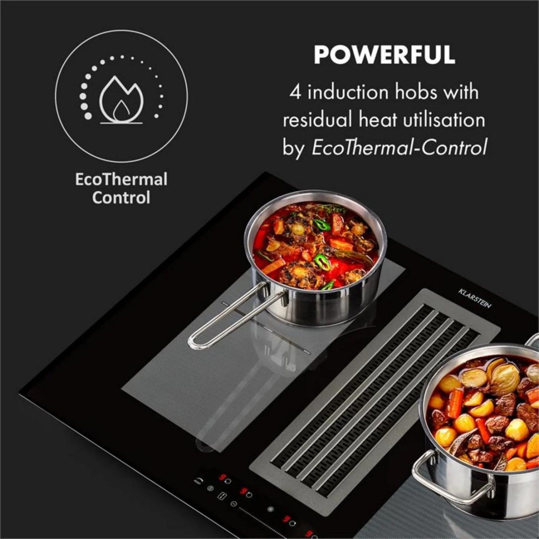 Výkonná indukčná varná doska DownAir systému Klarstein Full House má štyri varné plochy pre malé aj veľké hrnce. Dve varné plochy sa nachádzajú na ľavej strane a dve na pravej strane vedľa odsávacieho otvoru odsávača DownAir a vďaka systému VarioHeating sa dá každá strana prakticky prepojiť na veľkú flexi zónu, napríklad pre veľké hrnce a panvice. Každá varná plocha sa dá nastaviť v 9 úrovniach a má funkciu ThermoBoost na zvýšenie výkonu pre veľmi rýchle uvedenie obsahu hrncov do varu. Detekcia hrnca, funkcia Stop and Go s funkciou ThermalRecall, detekcia zvyškového tepla, detská poistka a funkcia udržiavanie tepla dokonale dopĺňajú rozsah využitia varnej plochy.